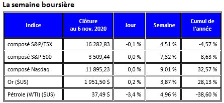 Les indices boursiers américains et canadiens ont affiché certaines des plus fortes hausses hebdomadaires observées cette année, alors que les fortes données sur la création d'emplois dans les deux pays ont contribué à améliorer le sentiment des marchés et que les résultats des élections américaines se sont rapprochés d'une résolution.