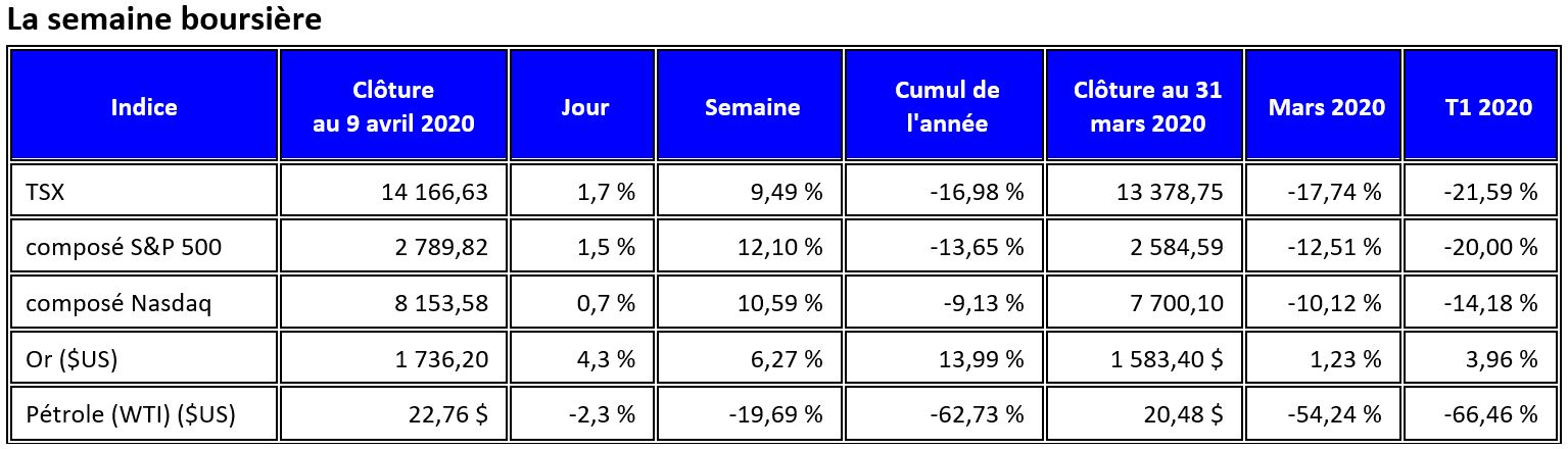 Bien que les marchés de capitaux mondiaux aient sombré en territoire baissier au cours du premier trimestre de l'année, surtout durant les quatre semaines du 18 février au 18 mars, il y a eu une sorte de reprise en avril. Un coup de d’œil au tableau ci-dessus nous dit tout. Au cours des trois premiers mois de l'année, l'indice composé S&P/TSX a accusé une perte de 21,6 %. Pourtant, cet horrible cumul annuel s'est rapidement réduit en avril, la perte s'établissant à 17 % à la clôture du marché le 9 avril, l'indice ayant gagné 9,5 % la semaine dernière. Il en est de même pour les autres principaux indices nord-américains. L'indice composé S&P 500 a gagné 12,1 % sur la semaine, tandis que l'indice composé Nasdaq a progressé de 10,6 %.