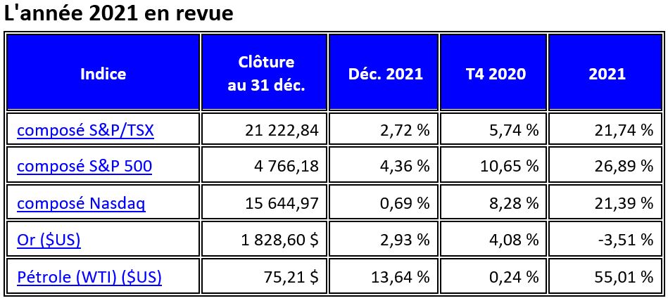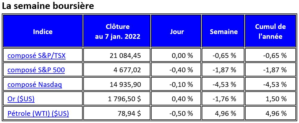L'indice composé S&P 500 a enregistré une perte hebdomadaire de 1,9 % pour commencer l'année, tandis que l'indice composé Nasdaq a plongé de 4,5 %, les actions technologiques et de santé (et la plupart des actions de croissance) ayant subi une forte pression à la vente après la publication des minutes du FOMC. L'indice composé S&P/TSX de Toronto a reculé de 0,7 % au cours de la semaine, sous l'effet des actions des technologies de l'information et des matériaux, alors même que le prix du pétrole brut a augmenté de 5,0 %. L'or est resté dans sa fourchette habituelle et a clôturé la semaine en baisse de 1,8 %.