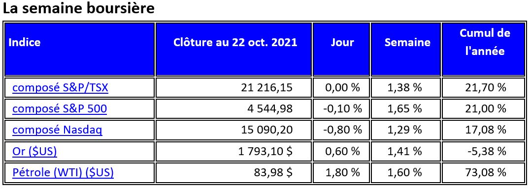 L'indice d'ensemble des prix à la consommation du Canada a augmenté à un taux annuel de 4,4 % en septembre, le rythme le plus rapide depuis 2003. L'indice d'ensemble américain a grimpé à 5,4 % en septembre. Le rendement du bon du Trésor américain à 10 ans a grimpé à 1,7 % jeudi, avant de ralentir pour terminer la journée de vendredi à 1,6 %. Les rendements des obligations canadiennes ont également grimpé, l'obligation à 10 ans du gouvernement du Canada ayant atteint 1,7 % vendredi avant de redescendre à 1,6 %.