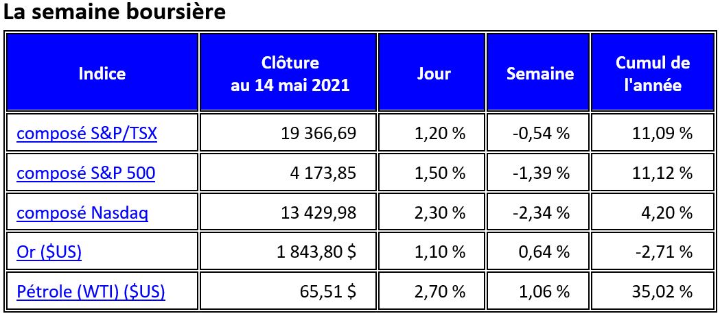 La hausse de l'inflation, reflétée par l'augmentation des prix des marchandises et les pénuries de main-d'œuvre aux États-Unis, a pesé sur les grandes jauges boursières nord-américaines la semaine dernière, entraînant des pertes hebdomadaires. L'indice d'ensemble des prix à la consommation aux États-Unis a augmenté à un taux annuel de 4,2 % en avril, tandis que l'indice de base (excluant les prix des aliments et de l'énergie) a affiché un taux annuel de 3,0 %. La flambée des taux était attendue, car les chiffres sur 12 mois se sont basés sur un taux de l'année précédente qui était largement réduit en raison du ralentissement économique lié à la Covid-19. Néanmoins, les chiffres mensuels de 0,8 % pour l'indice d'ensemble et de 0,9 % pour l'indice de référence ont dépassé les estimations des analystes. Les principales matières premières « barométriques » ont également progressé depuis le début de l'année, avec une hausse de 35 % pour l'or et de 38 % pour le cuivre.