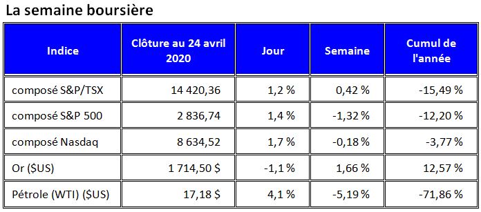 La récession de la Covid-19 a des effets prévisibles sur les indices boursiers; les principales jauges nord-américaines ont été freinées après une progression de courte durée cette semaine. Le chômage au Canada, avec 1 million d'emploi perdus en mars et un taux de chômage de 7,8 %, devrait s'aggraver en avril, lorsque le ralentissement économique national prendra toute son ampleur. Aux États-Unis, les demandes de prestations de chômage ont atteint plus de 26 millions la semaine dernière, et le taux de chômage devrait dépasser 15 %.