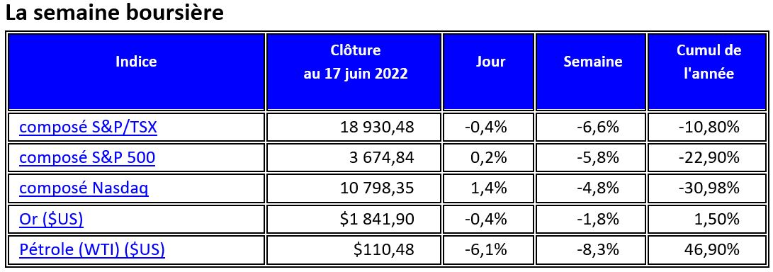Les principaux indices boursiers américains se sont repliés en marché baissier, l'indice composé S&P 500 perdant 5,8 % sur la semaine, pour une perte de 22,9 % depuis le début de l'année. L'énergie (-17,2 %), les services publics (-9,2 %) et les matériaux (-8,3 %) ont mené le déclin cette semaine. De même, l'indice composé Nasdaq a chuté de 4,8 % sur la semaine, en raison de la poursuite du repli des actions technologiques, et affiche désormais une baisse de 31 % depuis le début de l'année. Les craintes ont également atteint le marché des cryptomonnaies, le Bitcoin ayant perdu 29 % la semaine dernière et l'Ether 36 %.