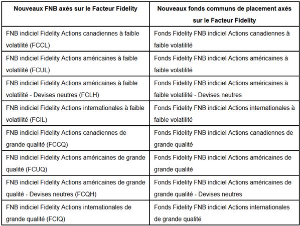 * Fidelity élargit sa gamme de FNB et de fonds communs de placement. Fidelity Investments Canada a élargi sa gamme de FNB et de fonds communs de placement avec le lancement de huit nouveaux FNB et fonds communs de placement à faible volatilité et de facteur de haute qualité, fondés sur des facteurs, présentés dans le tableau ci-joint.