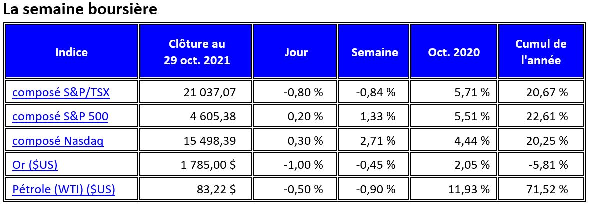 L'indice composé S&P 500 a clôturé vendredi à un niveau record de 4 605,38, soit un gain de 1,3 % sur la semaine et une progression respectable de 5,5 % pour le mois d'octobre, dans un contexte de résultats trimestriels supérieurs aux attentes, 82 % des entreprises ayant publié leurs résultats jusqu'à présent (environ la moitié du S&P 500) ayant présenté des résultats supérieurs aux estimations.
