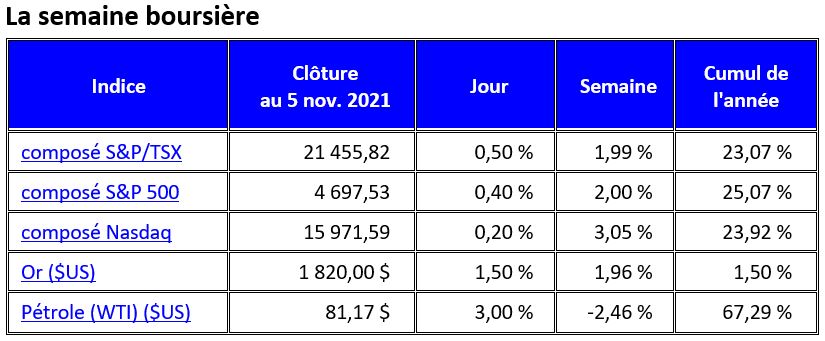 Les principaux indices boursiers américains et canadiens ont affiché des gains solides cette semaine, clôturant vendredi à des niveaux record, tandis que le sentiment des investisseurs a continué de virer vers l'optimisme. Aux États-Unis, les chiffres meilleurs que prévu du marché du travail ont été le moteur des gains la semaine dernière, l'économie ayant créé 531 000 nouveaux emplois en octobre, alors que le taux de chômage est tombé à 4,6 % au cours du mois. Près de 90 % des sociétés du S&P 500 ont à présent fait état de leurs bénéfices trimestriels, et près de 82 % de celles-ci ont surpassé les estimations pour cette période, améliorant davantage le sentiment des investisseurs. De plus, tel qu'il était fortement attendu, le Conseil de la Réserve fédérale des États-Unis a annoncé la semaine dernière, le commencement du resserrement de son programme d'assouplissement quantitatif visant l'achat d'actifs ce mois. Le rendement des bons du Trésor américain sur 10 ans est descendu à 1,453 % à la clôture de vendredi, son niveau le plus bas depuis fin septembre.