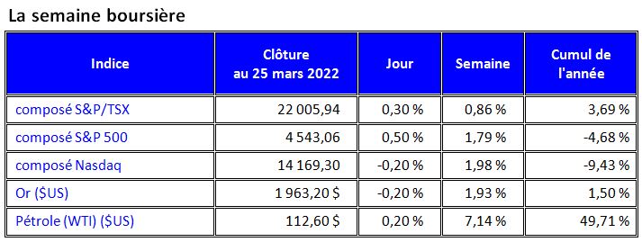 Les grands indices boursiers nord-américains ont enregistré une nouvelle semaine de gains, les marchés américains se relevant de deux mois et demi de baisses régulières enregistrées depuis fin décembre. Les actions s'étaient déjà engagées sur la voie de la réévaluation bien avant l'invasion de l'Ukraine par la Russie fin février, les banques centrales prenant un ton de plus en plus belliciste face à la hausse persistante des taux d'inflation.
