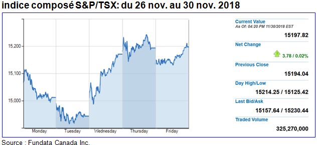 * Les indices boursiers progressent sur la semaine. Les principaux indices boursiers nord-américains ont réalisé une progression au cours de la semaine passée, freinant la liquidation globale de ces deux derniers mois volatiles. Quand bien même la chute du cours du pétrole brut (en baisse de 22,5 % en novembre, pour une perte de 16,2 % sur le cumul annuel) a pesé sur le secteur énergétique au Canada, l'indice composé S&P/TSX de Toronto a gagné 1,3 % sur la semaine, alors qu'une croissance plus faible du PIB au troisième trimestre (2,0 %), avait laissé espérer que la Banque du Canada reporterait toute hausse de taux d'intérêt supplémentaire. L'indice a gagné 1,1 % sur le mois, mais reste en baisse de 6,2 % sur le cumul annuel. Aux États-Unis, des indications selon lesquelles la Chine et les USA pourraient parvenir à un accord commercial au sommet du G20 à Buenos Aires, ont permis de pousser les principaux indices boursiers à des gains solides sur la semaine. L'indice composé S&P 500 a avancé de 4,9 % sur la semaine, pour un gain de 1,8 % sur le mois, lui donnant une avance de 3,2 % sur le cumul de l'année. De même, l'indice composé Nasdaq a grimpé de 5,6 % sur la semaine, entrant tout juste dans le noir pour le mois, mais gardant son avance de 6,2 % sur le cumul annuel.