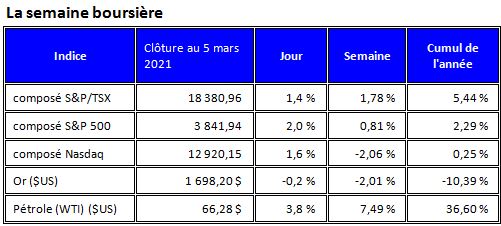 Un solide rapport des emplois aux États-Unis et la stabilisation des rendements obligataires ont permis d'atténuer l'anxiété des investisseurs sur les marchés boursiers, les principaux indices boursiers ayant clôturé la session de vendredi à la hausse. Les États-Unis ont créé 379 000 nouveaux emplois en février, ce qui, avec la généralisation de la distribution du vaccin contre la Covid-19 et la proposition de relance budgétaire de 1 900 milliards de dollars dont le Sénat est actuellement saisi, a suscité chez les investisseurs l'espoir d'une reprise économique plus rapide cette année. Le taux de chômage américain est descendu à 6,2 % en février, contre 6,3 % en janvier.