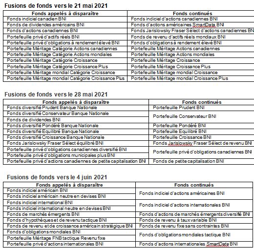 * BNI procède à un festival de fusions de fonds. Banque Nationale Investissements Inc. a annoncé le 1er mars une série de fusions de fonds conçue pour simplifier la gamme de produits BNI, tout en procurant des avantages aux investisseurs et aux conseillers offrant les fonds BNI.