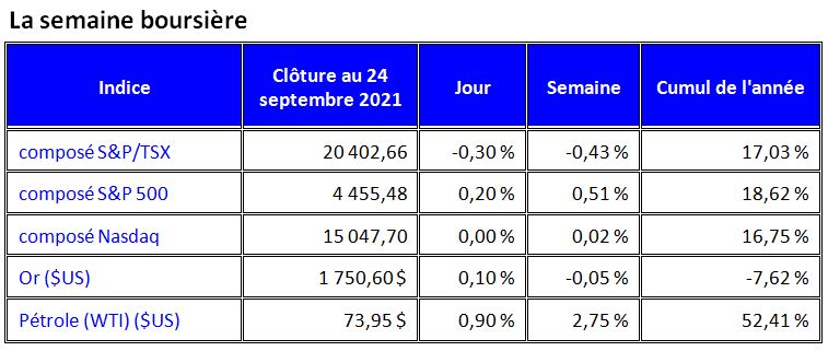 L'agitation du marché autour d'Evergrande a été quelque peu atténuée en fin de semaine par l'attitude de plus en plus belliqueuse de la Fed et sa volonté de s'engager sur un calendrier de réduction progressive des taux d'intérêt. En conséquence, l'indice composé S&P 500 a légèrement progressé de 0,5 % sur la semaine, tandis que l'indice composé Nasdaq a récupéré ses pertes antérieures pour terminer la semaine à un niveau stable. En raison de la pression exercée sur les matériaux et la technologie, l'indice composé S&P/TSX a reculé de 0,4 % sur la semaine, évitant des pertes plus importantes lorsque le secteur de l'énergie s'est renforcé grâce à un gain hebdomadaire de 0,9 % des prix du pétrole brut.