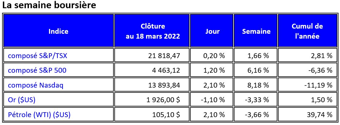 Au Canada, l'indice global des prix à la consommation a augmenté de 5,7 % sur une base annuelle. Ces données ont déjà été largement anticipées par les marchés, la Banque du Canada ayant déjà appuyé sur la gâchette des augmentations de taux, tout en signalant un resserrement supplémentaire à venir. L'indice composé S&P/TSX de Toronto a gagné 1,7 % sur la semaine, maintenant sa série de gains hebdomadaires, grâce à la vigueur des technologies de l'information, des soins de santé, des produits de consommation discrétionnaire, des banques et des services financiers. Les secteurs de l'énergie ont été à la traîne, le pétrole brut ayant reculé de 3,7 % au cours de la semaine, ce qui a freiné l'essor du secteur de l'énergie, le secteur le plus performant de l'indice S&P/TSX, avec un gain de 23 % depuis le début de l'année. L'or, quant à lui, a reculé de 3,3 % sur la semaine, la négociation à risque faible ayant perdu de l'attrait.