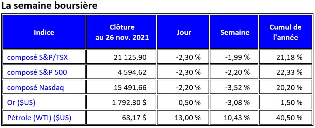 Une semaine écourtée pour les marchés boursiers américains, associée à des inquiétudes croissantes concernant le nouveau variant de la Covid découvert en Afrique du Sud et à une inflation toujours élevée, ont contribué à faire chuter les marchés au cours de la semaine. Aux États-Unis, l'indice des dépenses de consommation personnelle a montré que les dépenses de consommation ont augmenté à un taux annuel de 5,0 % en octobre, par rapport à 4,4 % en septembre, encouragées par une demande appuyée de biens et de services. Même l'indice de référence, qui exclut les prix de l’alimentation et de l'énergie a affiché une augmentation de 4,1 % d'une année sur l'autre. La persistance de l'inflation inquiète les investisseurs quant au calendrier du Conseil de la Réserve fédérale, qui planifie non seulement de resserrer son programme d'assouplissement quantitatif, mais aussi de commencer à augmenter ses taux directeurs, ce qui était prévu pour le milieu de l'année prochaine mais pourrait maintenant survenir plus tôt. En outre, le président américain Joe Biden a confirmé un nouveau mandat pour l'actuel président de la Fed, Jerome Powell, qui est perçu comme étant assez belliciste, bien que ce ne soit pas prouvé.