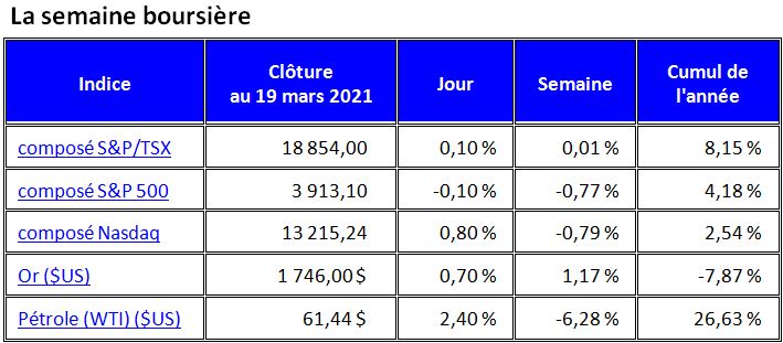 Les principaux indices boursiers nord-américains ont clôturé vendredi près de seuil de rentabilité pour la semaine, les indices américains se situant juste un peu en dessous et l'indice de référence canadien étant stable. Les investisseurs ont d'abord digéré l'annonce de la Réserve fédérale américaine, mercredi, qui a maintenu le taux des fonds fédéraux entre 0 % et 0,25 %. Les rendements des obligations du Trésor ont de nouveau augmenté après l'annonce, le bon du Trésor américain à 10 ans grimpant à 1,73 % à la clôture du vendredi, les marchés continuant d'anticiper une forte croissance, une inflation croissante et des taux directeurs plus élevés. Jeudi, la Fed a annoncé qu'elle annulait une exemption temporaire à la règle selon laquelle les banques américaines doivent inclure les bons du Trésor dans le calcul de leur ratio de levier supplémentaire. Cette décision a mis les actions bancaires sous pression, pesant à la fois sur l'indice composé S&P 500 et sur l'indice composé Nasdaq, qui ont tous deux enregistré une légère baisse de 0,8 % sur la semaine.