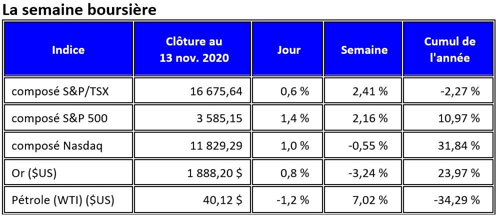 L'espoir d'un vaccin efficace contre la Covid-19 a permis aux marchés boursiers d'afficher des gains importants sur la semaine, alors que l'indice composé S&P 500 a clôturé vendredi à un niveau record, avec une hausse de 2,2 % sur la semaine. Le géant pharmaceutique Pfizer Inc. (NYSE: PFE), avec BioNTech SE (NSD: BNTX), a annoncé un vaccin efficace à 90 % au cours de la phase 3 des essais cliniques. Les investisseurs se sont réjouis de la nouvelle, détournant l'attention du secteur brûlant de la technologie, au profit de secteurs considérés comme bénéficiant de la reprise économique, notamment les soins de santé, les finances, l'industrie et les matériaux.