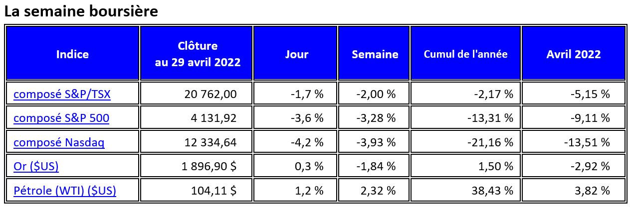 L'indice composé S&P 500 a perdu 3,6 % sur la semaine, pour une perte de 9,1 % en avril. L'indice est en baisse de 13,3 % sur le cumul de l'année, et figure en territoire de correction. De même, l'indice composé Nasdaq a encaissé les coups des ventes des actions des méga-capitalisations, avec une perte de 3,9 % sur la semaine, pour une perte totale de 13,5 % sur le mois. Le Nasdaq est en baisse de 21,2 % sur le cumul de l'année, et descend de 23 % par rapport à son sommet de novembre, entrant en territoire de marché baissier.