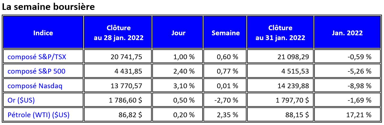 L'indice composé S&P 500 de New York a progressé de 0,8 % sur la semaine, tout en affichant une baisse de 5,3 % pour l'ensemble du mois de janvier. L'indice composé Nasdaq a clôturé la semaine sur une note stable, mais a terminé le mois de janvier sur une baisse de 9,0 %, les investisseurs ayant boudé les actions de croissance en général et les méga-capitalisations technologiques en particulier.