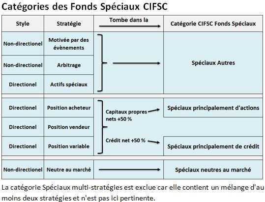 Comme pour les catégories existantes, le but du CIFSC pour les Fonds Spéciaux était de fournir aux investisseurs un ensemble complet de définitions qui regroupent des fonds possédant des profils de mandats, de risque et de rendement similaires. Une partie du défi que représente la définition de catégories réside dans l'éventail de stratégies et de catégories d'actifs qui sont disponibles aux fonds communs de placement spéciaux. Même au sein d'une stratégie particulière, les fonds peuvent varier considérablement de telle sorte qu'ils peuvent sembler tant différents que similaires. Le comité a finalement décidé de structurer et nommer les nouvelles catégories selon quatre types de stratégies largement différentes : Spéciaux principalement d'actions, Spéciaux principalement de crédit, Spéciaux neutres au marché et Spéciaux multi-stratégies. Une cinquième catégorie, Spéciaux Autres, est réservée aux fonds avec une stratégie unique qui ne rentre dans aucune des autres catégories.