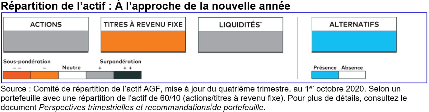 Nous privilégions les actions plutôt que les titres à revenu fixe dans le cadre d’un portefeuille 60/40 qui servira bien les investisseurs lorsque l’on considère la prochaine année dans son ensemble. Au chapitre des actions, une stratégie d’« haltères » qui se concentre sur les sociétés de croissance de qualité, mais qui s’intéresse également aux actions cycliques, aidera les investisseurs à tirer leur épingle du jeu compte tenu de l’incertitude à court terme qui pèse sur l’économie ainsi que sur la voie de la reprise. Mais à mesure qu’un vaccin s’impose et que l’embellie économique se consolide, il conviendra de privilégier les secteurs du marché qui se sont bien comportés lors des hausses précédentes. Les marchés émergents, par exemple, tendent à être particulièrement rentables dans les nouveaux cycles économiques, tout comme les produits de base et les secteurs les plus liés aux premiers stades d’une expansion, tels que la finance, la consommation discrétionnaire et les biens industriels.