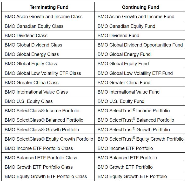 BMO proposes to merge each of the following corporate class mutual funds into corresponding mutual fund trusts. Subject to approvals, the mergers will be implemented after the close of business on or about Aug. 25, 2023.