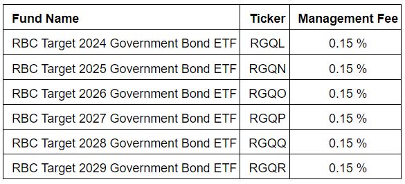 Each new RBC Target Maturity Government Bond ETF will hold a mix of federal, provincial and agency bonds, and is designed to represent the performance of a portfolio of such bonds with the same maturity year as the ETF, held to maturity.