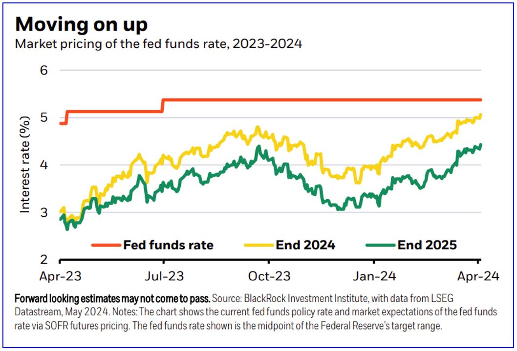 First-quarter inflation surprises have pushed the Fed to flip on its December view and at its meeting earlier this month, accept that interest rates will have to stay high for longer. We’re in a world shaped by structural forces and supply – creating greater uncertainty for the Fed and markets. That’s why we eye new data, not Fed signals, to gauge the policy path. We see high-for-longer rates, a view markets now reflect. We stay overweight U.S. stocks as solid corporate earnings help offset pressure from high rates.
