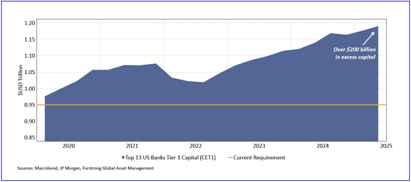 Crucially, large U.S. banks are in solid health, even before factoring in the deregulation agenda of the current government. Despite the recent series of losses, loan loss provision ratios actually fell for most big banks this quarter. Per the chart below, the top 13 banks in the U.S. currently have over $200 billion in excess capital. This should continue to enable share buybacks, acquisitions, and provide a safety net for the broader industry, much as large banks did during the SVB crisis, when they acted as a stabilizing backstop to prevent contagion.
