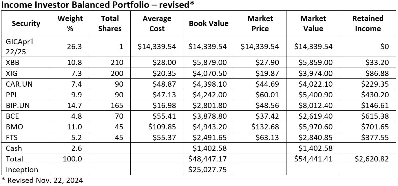 The portfolio had an initial valuation of $25,027.75. The goal was to achieve a return that at least matched the best available five-year GIC rate plus two percentage points.