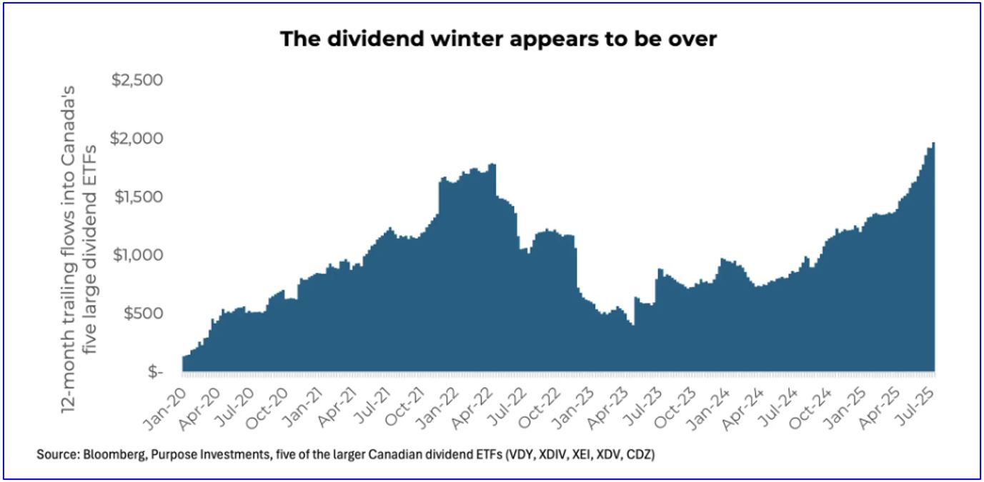 This trend appears to have started and accelerated in 2025, and money is flowing into the dividend factor. Tracking five of the largest ETFs available in Canada, trailing 12-month flows dried to a trickle in 2023 as yields rose and cash was the go-to asset class. But inflows improved a bit in 2024, and then have really accelerated in 2025. Dividends are back!!!
