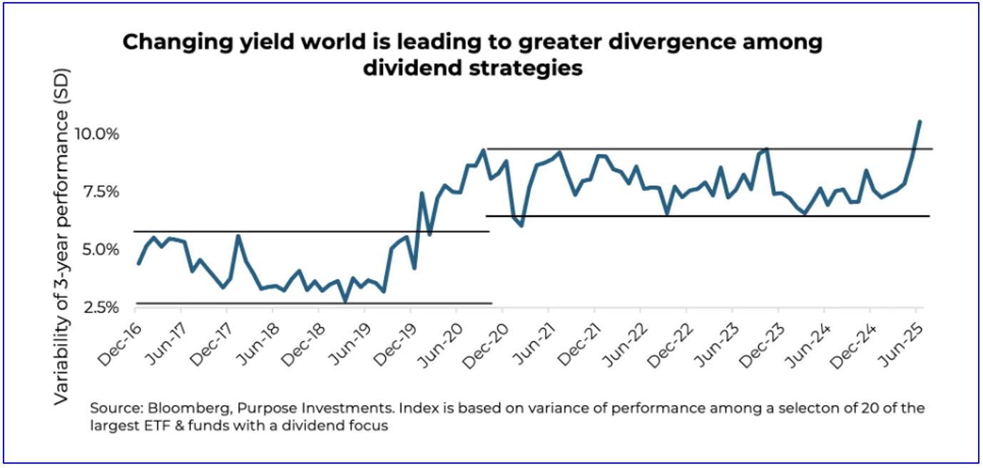 The chart below is the standard deviation of three-year rolling performance among 20 of the largest dividend-focused ETFs and funds available in Canada. An important consideration is the Covid market volatility of 2020, as we had a bit less conviction in this trend as long as that year was still in the three-year rolling number. However, it has rolled off the back of the three-year variance among dividend strategies, and it is still rising. It now matters more how you get exposure to dividends.