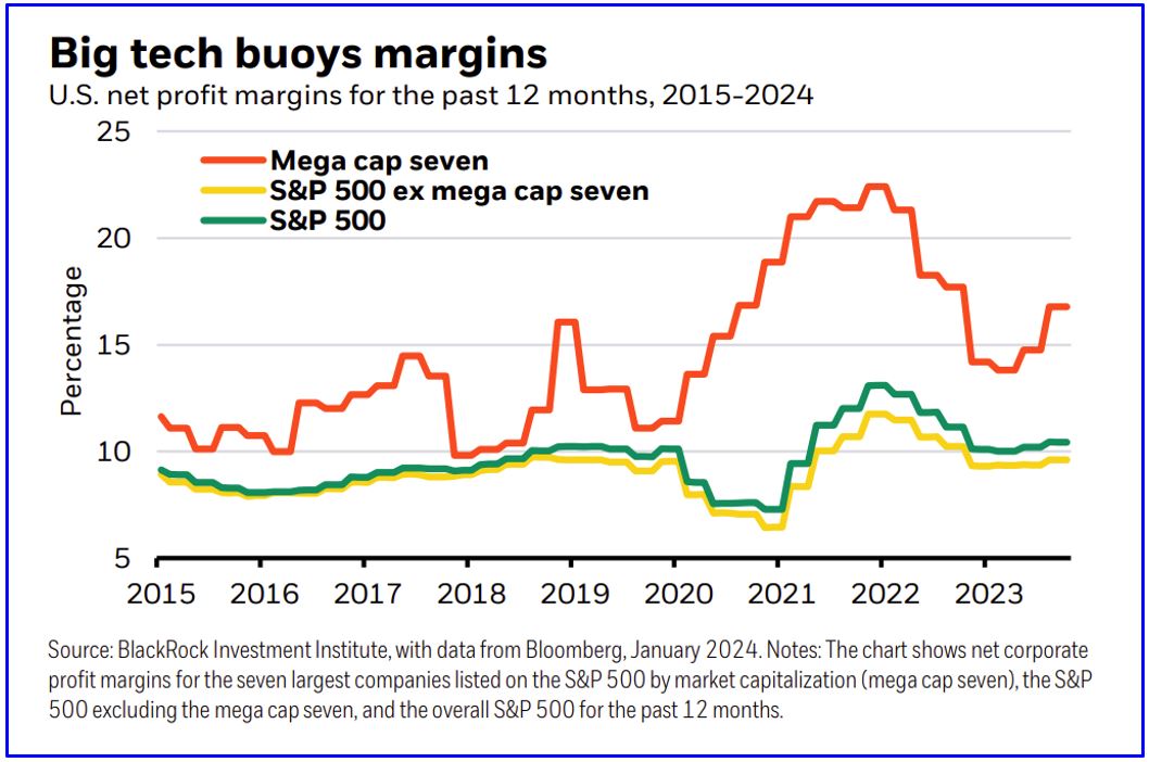 U.S. fourth-quarter corporate earnings season is in full swing. We don’t see it spoiling upbeat risk appetite for now. The S&P 500 hit an all-time high recently as most top tech firms beat high earnings expectations. Yet we think earnings will recover less than markets expect this year after stagnating in 2023. Tech gains and cost cutting have buoyed margins, but we see pressures mounting over time. We’re overall overweight U.S. stocks as we think rosy market sentiment can persist for now.