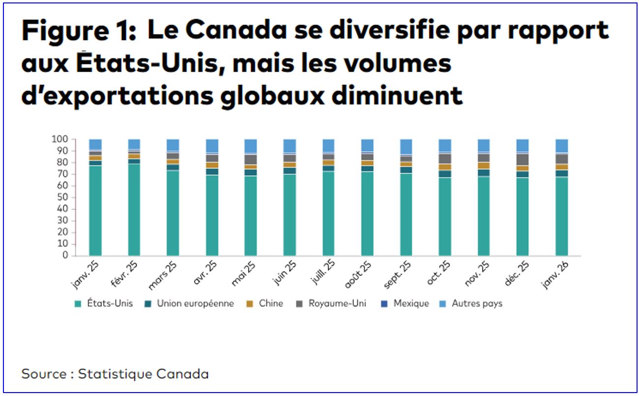 Les exportations nettes ont toutefois freiné la croissance. Bien que le statut du Canada en tant qu’exportateur net d’énergie ait fait contrepoids, le PIB global a été soutenu mécaniquement par la baisse des importations, un rajustement qui reflète une baisse de la demande intérieure plutôt qu’une amélioration de la compétitivité. Le rendement des exportations a été limité par les droits de douane sectoriels sur le bois d’œuvre, l’acier, l’aluminium et les pièces automobiles qui ne sont pas visés par l’ACEUM. Même si le Canada a réalisé des progrès pour diversifier son exposition aux exportations vers les États-Unis, comme le montre la figure 4, dans laquelle la part des exportations américaines est passée de 76 % en décembre 2024 à 68 % en janvier 2026, la situation demeure difficile dans son ensemble. Les exportations totales ont reculé d’environ 10 % au cours de la même période, ce qui souligne la difficulté de traduire les efforts de diversification en croissance globale des exportations.