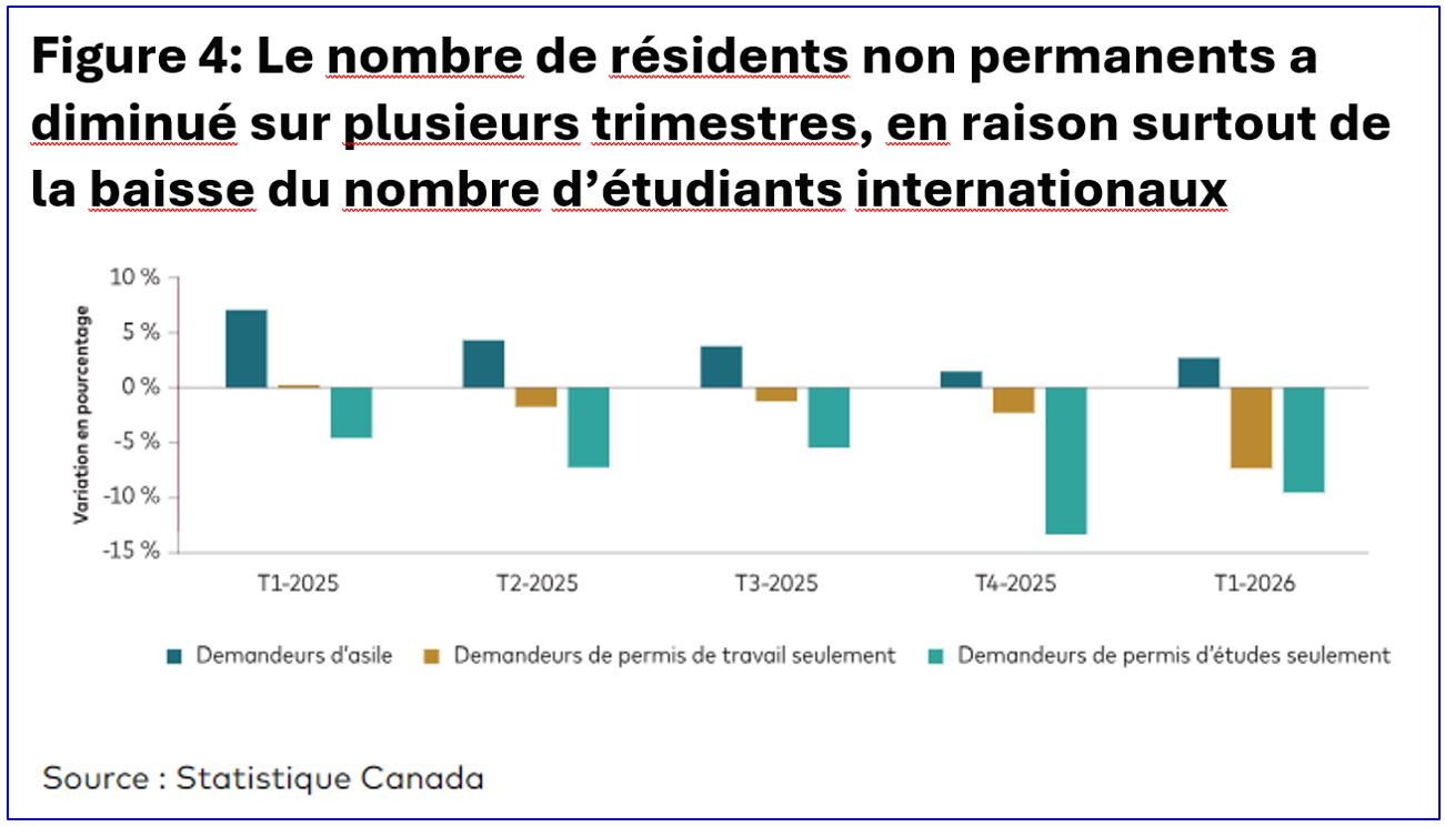 Le ralentissement abrupt de la croissance de la population active est une caractéristique déterminante du marché actuel de l’emploi au Canada. Après plusieurs années d’augmentation rapide de la population, la croissance a stagné à la suite d’une baisse délibérée de l’immigration et des résidents non permanents. Les données font désormais clairement état des changements apportés à la politique fédérale visant à réduire le nombre d’étudiants internationaux et de travailleurs temporaires, comme le montre la figure 7, le nombre de titulaires de permis d’études ayant diminué au cours des derniers trimestres.