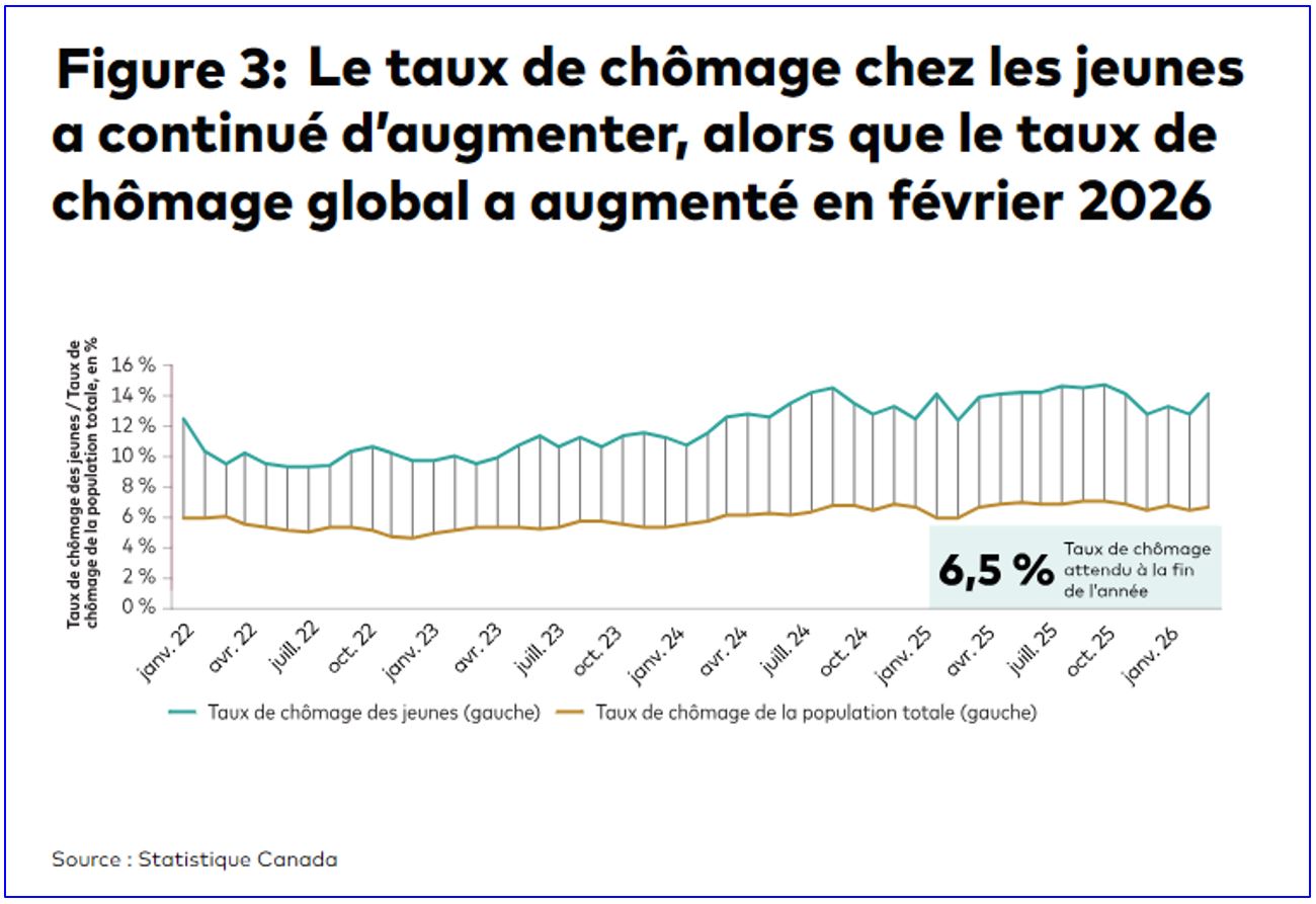 Au début de 2026, le marché de l’emploi a subi un choc inattendu, le Canada ayant perdu près de 110 000 emplois même si la croissance de la population avait déjà stagné au deuxième semestre de 2025. La baisse sur deux mois a été généralisée et concentrée dans le secteur privé et les emplois à temps plein, un ensemble de dynamiques néfastes pour le marché du travail. Le nombre moyen d’heures travaillées est également passé de 32,9 en janvier à 31,1 en février. Bien que les résultats de l’Enquête sur la population active soient intrinsèquement volatils et que les données mensuelles doivent être interprétées avec prudence, les tendances sous-jacentes sont préoccupantes. Les pertes d’emplois consécutives ont eu pour effet d’effacer la majeure partie des gains d’emplois enregistrés à la fin de 2025, la majeure partie du recul s’étant produite dans le secteur privé, en raison des licenciements au sein des entreprises confrontées à une baisse de la demande et à une hausse des pressions sur les coûts. En février, le taux de chômage est passé de 6,5 % à 6,7 % (voir la figure 6).