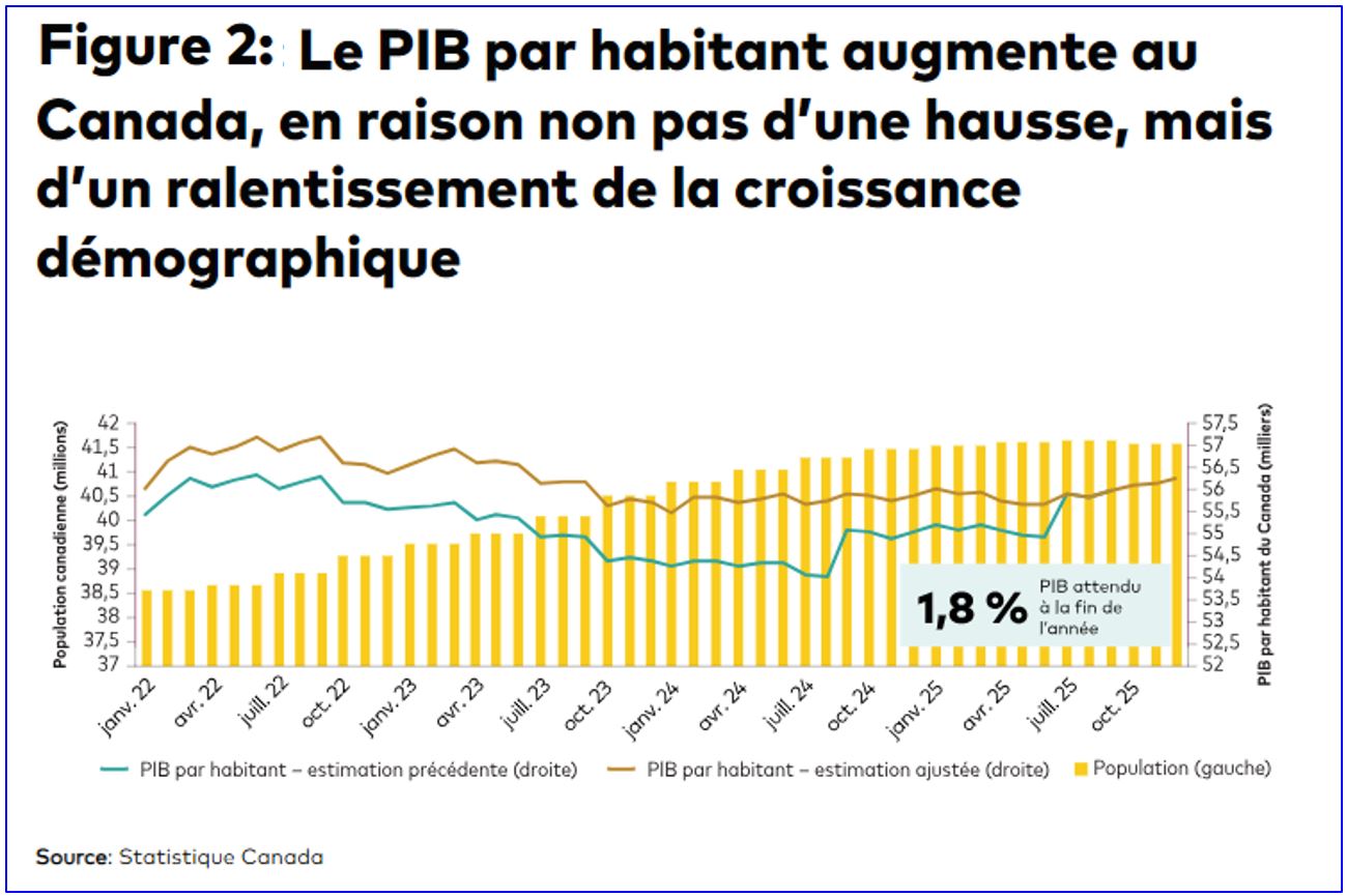 Le PIB par habitant du Canada a augmenté au cours des derniers trimestres, comme le montre la figure 5. Un facteur clé a été le ralentissement marqué de la croissance de la population, qui semble avoir reculé de 75 000 personnes sur une base nette semestrielle dans la deuxième moitié de 2025 d’environ, ce qui a permis à l’économie d’éviter une baisse prononcée de la production par habitant. Au début du cycle, les gains rapides sur le plan démographique ont constamment surpassé la création d’emplois et la croissance de la production, ce qui a fait reculer le PIB par habitant, même si le PIB global a augmenté. Au milieu de 2025, la courbe de croissance de la population s’était aplatie, ce qui avait atténué la dilution arithmétique de la production et permis au PIB par habitant de se redresser.