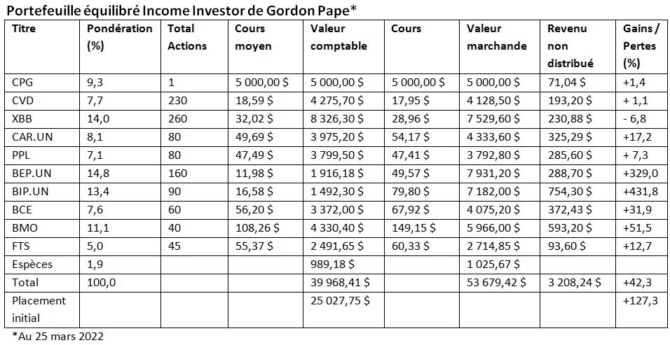 Contenu © 2022 par Gordon Pape Enterprises. Tous droits réservés. Reproduction autorisée. Ce qui précède est à des fins d'information générale uniquement et n'engage que l'opinion de l'auteur. Les titres mentionnés présentent un risque de perte et aucune garantie de performance n'est établie ou implicite. Ces informations ne visent pas à fournir des conseils personnalisés spécifiques, y compris, mais sans s’y limiter, des conseils en placement, financiers, juridiques, comptables ou fiscaux. Demandez toujours conseil à votre propre conseiller financier avant de prendre des décisions en matière d'investissement.