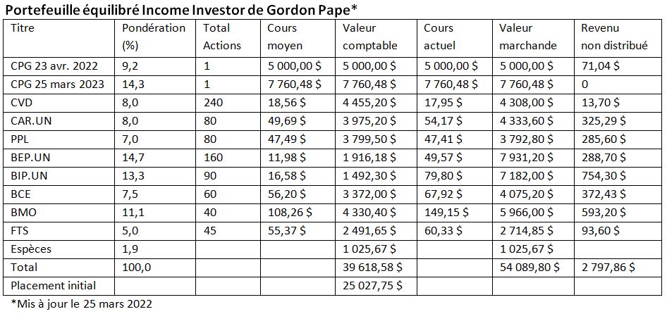 Le 23 avril, lors de l'arrivée à échéance du CPG actuel à Peoples Bank, les bénéfices seront transférés vers un nouveau CPG d'un an, également à la Banque EQB. De cette façon, la majorité de nos actifs à revenu fixe seront protégés des pertes dans cet environnement de taux en hausse.
