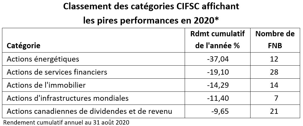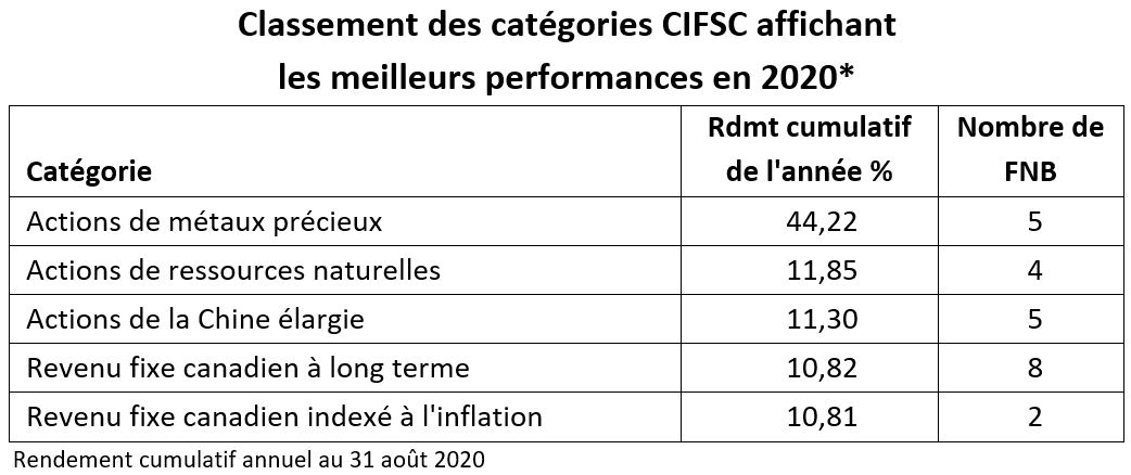 Les deux tiers de l'année 2020 se sont écoulés et pour la plupart, le 31 décembre est attendu avec impatience. Cette année a été pour le moins turbulente. Avant la fin de l'année 2019, 859 fonds négociés en bourse (FNB) avaient été lancés, et au 31 août, 412 d'entre eux ont obtenu des rendements positifs sur le cumul annuel. Mais comme toujours, ces résultats dépendent largement des catégories de fonds (nous utilisons les catégories définies par le comité canadien des standards des fonds d'investissement). La catégorie ayant réalisé la meilleure performance est celle des Actions de métaux précieux, avec une hausse moyenne de 44 %. De l'autre côté, les Actions énergétiques ont constitué la catégorie la moins performante, avec une perte moyenne de 37 %. Les tableaux ci-après montrent un classement des cinq meilleures et pires catégories en matière de performance.