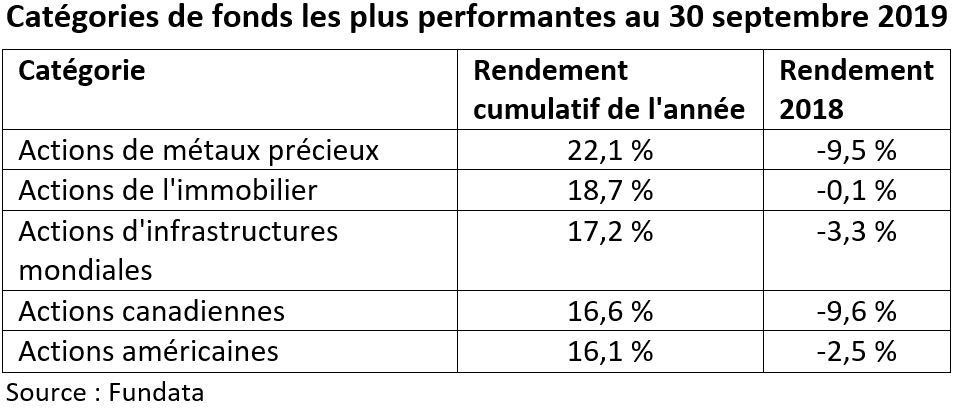 Le tableau ci-dessous présente les catégories les plus performantes au 30 septembre 2019.