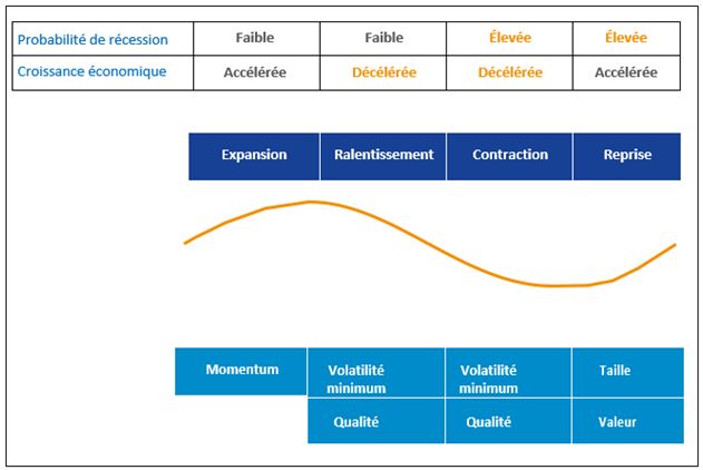 Différents facteurs ont historiquement réalisé de meilleures performances dans différents marchés et environnements économiques. Par exemple, alors que l'économie commence à ralentir, les facteurs de faible volatilité et de qualité enregistrent une surperformance. À l'inverse, lorsque les marchés sont à la hausse, les petites capitalisations, les facteurs de valeur et – plus tard dans le cycle – de momentum réalisent les meilleures performances.