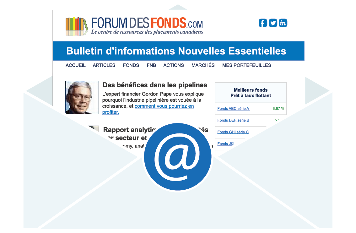 Bulletin d'informations : Suivez l'évolution du marché grâce aux faits saillants de Forum des Fonds. Le bulletin comprend des liens vers des articles récents rédigé par notre équipe d’experts en placement ainsi que la liste mensuelle des fonds les plus performants. |